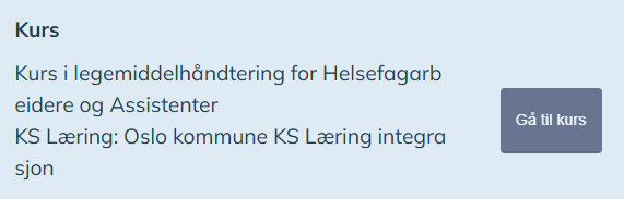 E-læringskurset "Kurs i legemiddelhåndtering for helsefagarbeidere og assistenter" for Oslo skal benyttes. Kurset er tilgjengelig fra KS Læring og i Kompetanseplanen Dersom kurset gjennomføres hjemmefra etter avtale med leder, gjør følgene: Opprett en brukerkonto på kslaring.no og logg inn med ID-porten Finn kurset "Legemiddelhåndtering for helsefagarbeidere og assistenter"
