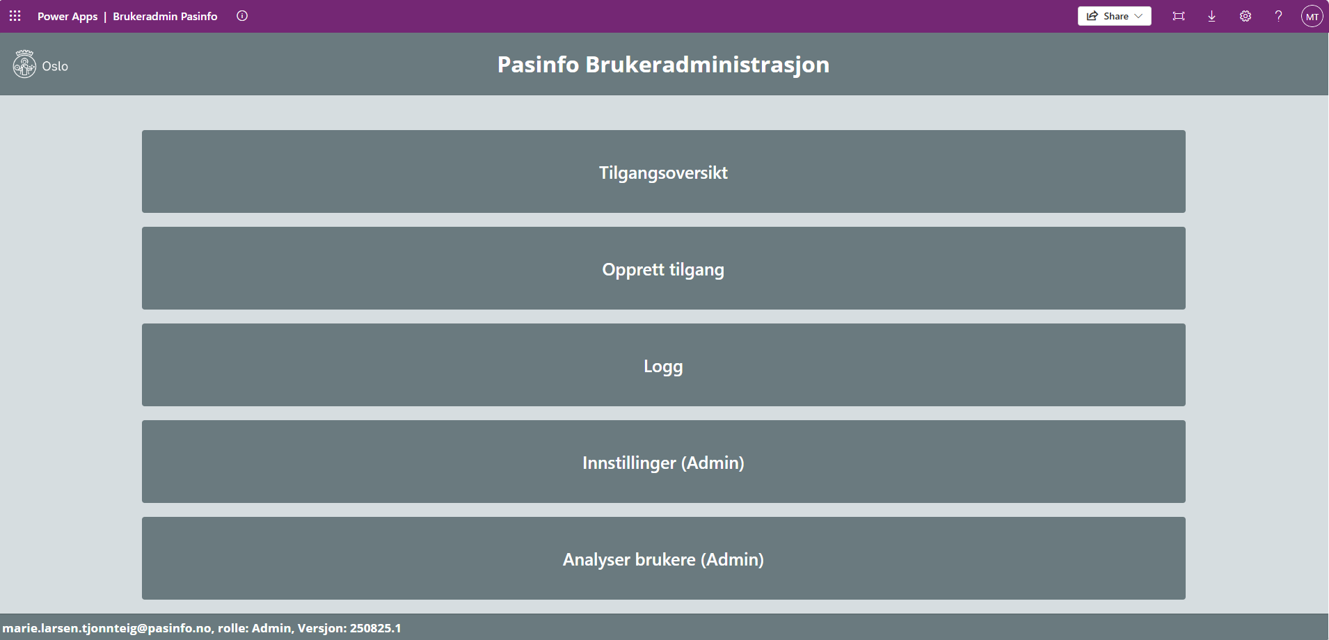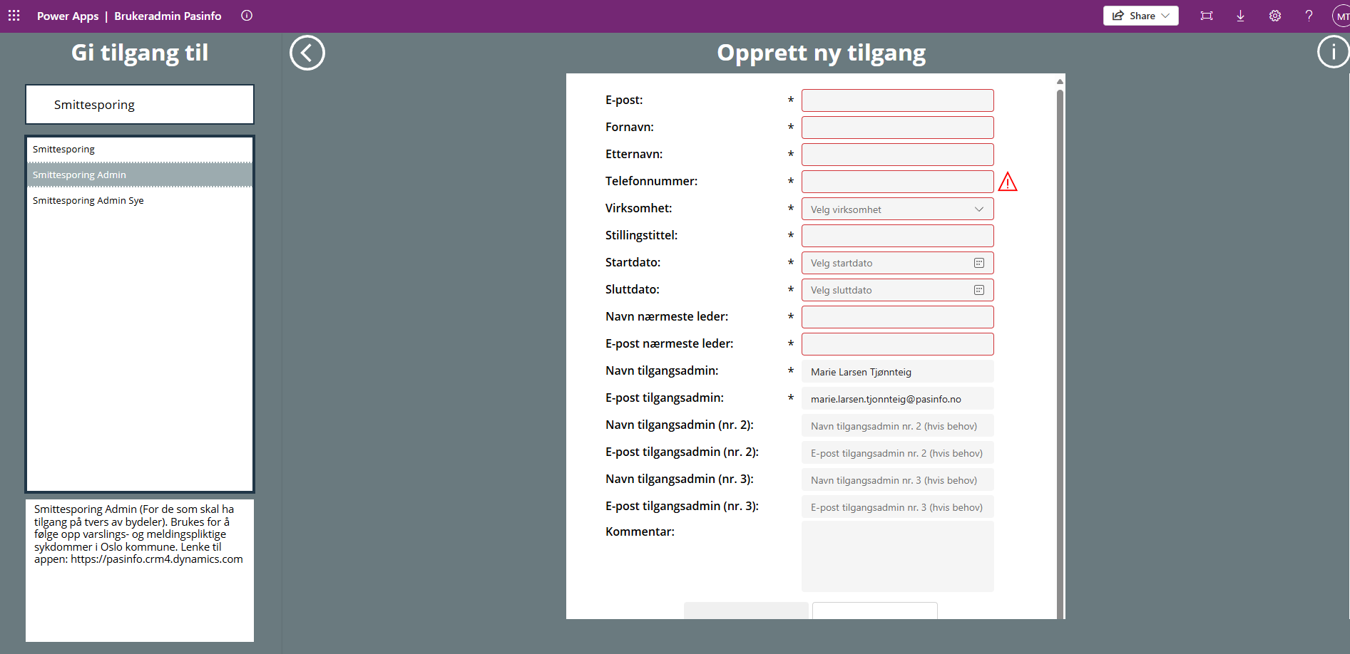 Tilganger bør helst meldes inn manuelt av ledere/superbrukere ved at man fyller ut excel-skjema for manuell innmelding av tilganger. Skjema som kan benyttes ligger under filer i Viva Engage-fellesskapet VI/HEL/Pasinfo Brukeradministrasjon (https://engage.cloud.microsoft/main/groups/eyJfdHlwZSI6Ikdyb3VwIiwiaWQiOiI2MDg4NzkzMjkyOSJ9/all) , samt på Sharepoint-siden for Pasinfo Support - Brukeradministrasjon: https://heloslokommuneno.sharepoint.com/sites/PasinfoSupport/SitePages/Brukeradministrasjon.aspx. Skjemaet fylles ut og sendes inn til support@pasinfo.no, og tilganger kan da gis manuelt i Microsoft Entra ID/Power Platform Admin Center. Så fort Brukeradmin-appen igjen er oppe og går, bør de samme tilgangene gis på nytt i Brukeradmin-appen på vanlig måte slik at logg oppdateres med detaljert info om f.eks sluttdato og nærmeste leder. Dette oppfølgingsarbeidet skal gjøres av forvalter/superbruker.