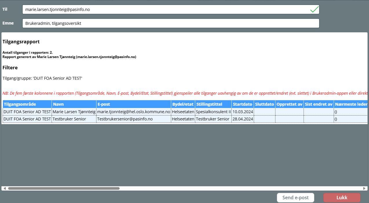 Klikk på «send e-post» for å få tilsendt listen til din jobb-epost. Derfra kan den videresendes til leder for gjennomgang. Fjern eventuelt de som har tilganger «på tvers» og som ikke tilhører din bydel/etat før du videresender, dette kan redigeres direkte i Outlook før videresending.