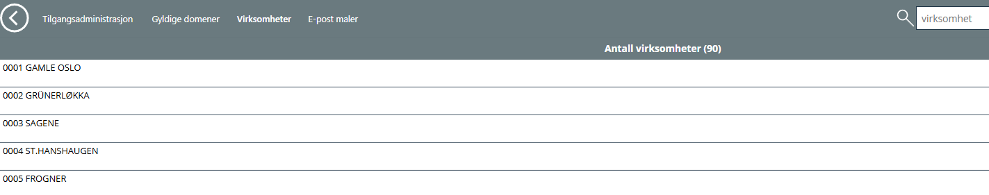 Virksomheter brukes kun av Pasinfo Admin. Her kan man søke opp (søkefeltet oppe til høyre), slette (søppelbokssymbolet lengst til høyre på hver linje) eller velge Legg til virksomhet (helt nederst). Både sletting og oppretting av virksomheter skal være avklart internt i Team Pasinfo. Listen over virksomheter skal være oppdatert og skal oppfylle behovet hos brukerne i tjenesten, den er ikke knyttet til noen form for organisasjonskart og må vedlikeholdes manuelt. Ta kontakt med support dersom du mener at det mangler noen virksomheter eller har andre innspill rundt dette.