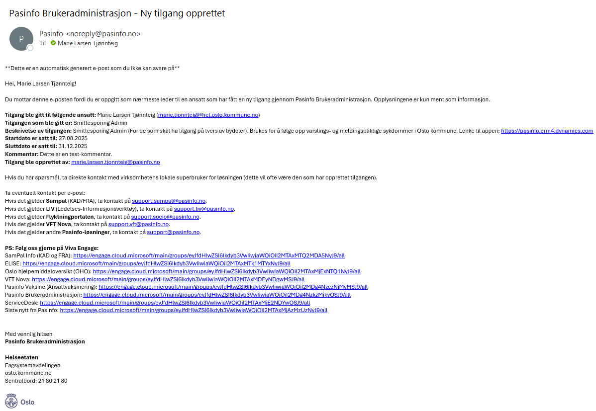 Det blir også sendt ut en automatisk e-post til nærmeste leder om at en ansatt har fått en ny tilgang. Hvis man velger å skrive en kommentar når tilgang gis, vil denne bli inkludert i e-post til nærmeste leder. E-posten ser slik ut (eksempel):