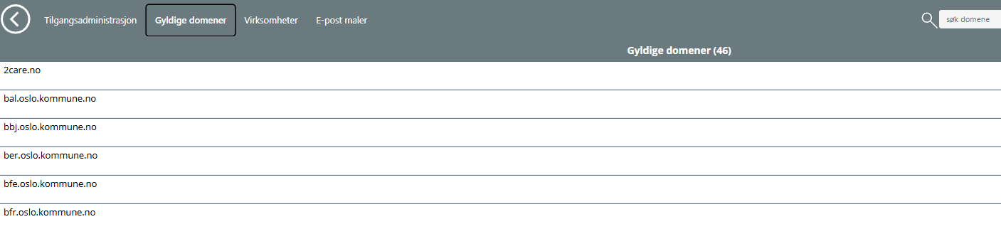 Gyldige domener brukes kun av Pasinfo Admin. Her kan man søke opp (søkefeltet oppe til høyre), slette (søppelboks-symbol lengst til høyre på hver linje) eller velge Legg til nytt domene (helt nederst). Både sletting og oppretting av domener skal være avklart internt i Team Pasinfo, og det er kun domener for jobb-epostadresser tilhørende ansatte med tjenstlig behov for tilgang som skal legges til. Eksempel: Domener som brukes av private sykehjemsinstitusjoner organisert under Sykehjemsetaten, eller private leverandører av hjemmetjenester som er organisert under Velferdsetaten i Oslo kommune. Listen over godkjente domener skal være oppdatert til enhver tid og kun inneholde domener som er nødvendige for aktive tilganger med tjenstlig behov p.t.