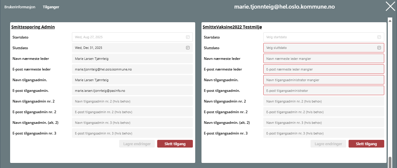 Brukerinformasjon (endre informasjon om en ansatt)Tilganger (slette tilganger og angi eller endre sluttdato)