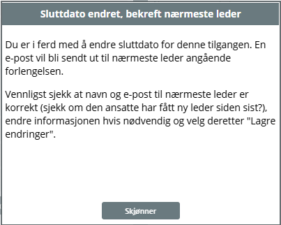 Ved forlenging av tilgang, får du opp denne beskjeden. Forsikre deg om at riktig nærmeste leder er registrert for den ansatte før du bekrefter ved å trykke på "Skjønner" og går videre.