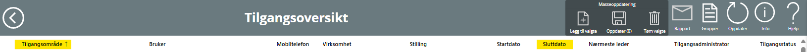 Du kan sortere tilgangsoversikten ved å trykke på kolonnene Tilgangsområde (sorter fra A til Å eller Å til A) eller Startdato (sorter etter nærmeste dato eller dato lengst frem).