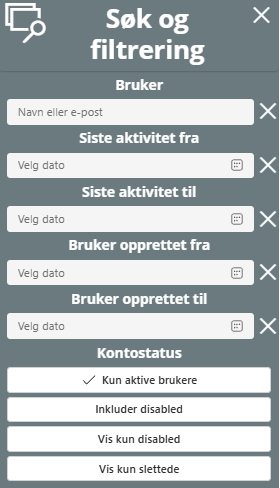 - Få oversikt over inaktive brukere, eller brukere som aldri har vært logget inn, og vurdere å deaktivere disse. Da vil alle brukerens tilganger slettes automatisk.