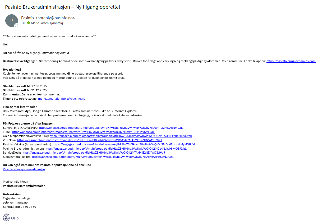 Det blir automatisk sendt ut en e-postbekreftelse med informasjon til den som har fått tilgang. E-posten ser slik ut (her er tilgangen Smittesporing Admin brukt som eksempel):
