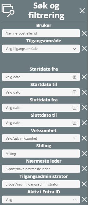 Du kan også bruke boksen for Søk og filtrering for å lete mer spesifikt etter visse tilganger: