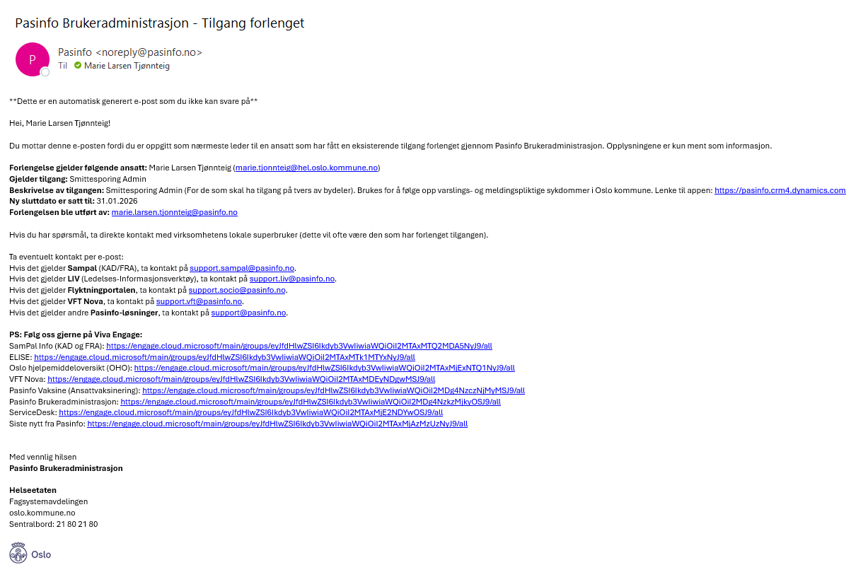 Ved forlenging av tilgang for en ansatt (sluttdato endres til en dato lenger frem i tid) blir man bedt om å bekrefte og evt. oppdatere informasjon om hvem som er nærmeste leder for den ansatte. Deretter går det ut en automatisk e-post til lederen om tilgangen som er blitt forlenget. E-posten ser slik ut (eksempel):