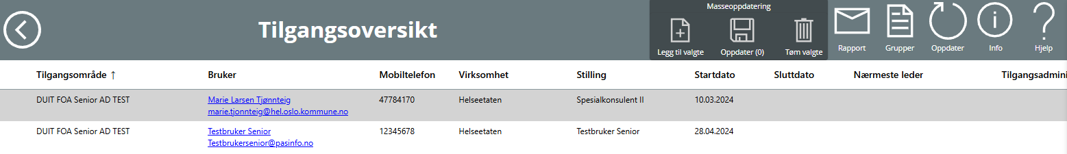 I Tilgangsoversikt får du opp oversikt over alle ansatte som har samme tilganger som deg. Ansatte som har flere tilganger vil vises flere ganger i listen med én rad pr tilgang.