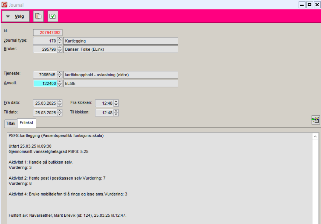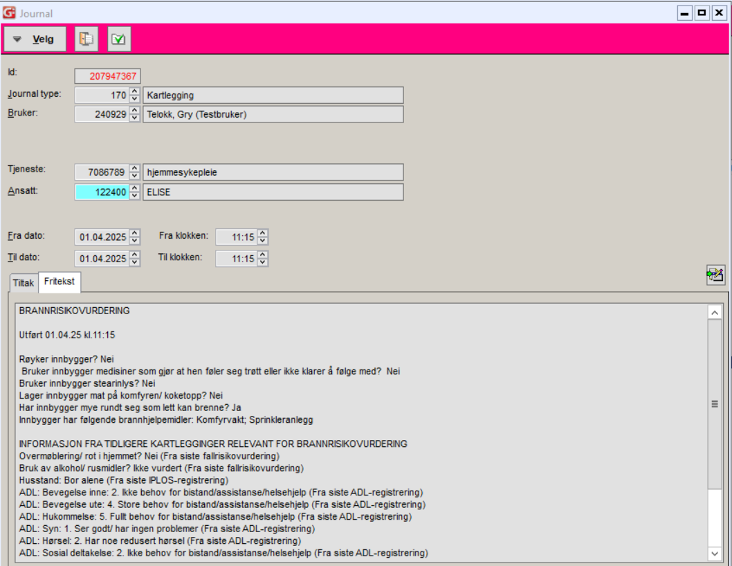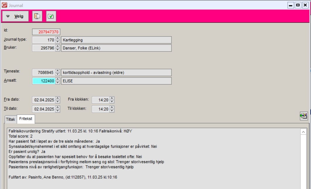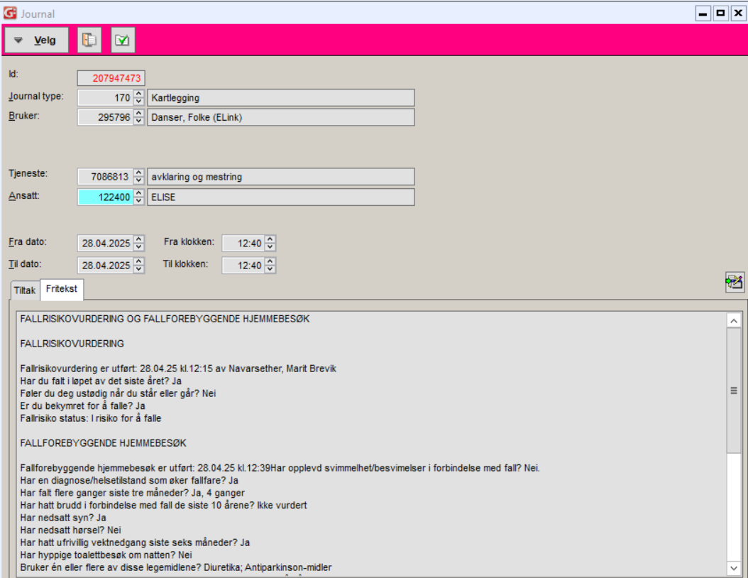 Fullførte fallrisikovurderinger blir overført til kartleggingsjournal (170). Ved utført fallrisiko og fallforebyggende hjemmebesøk overføres journalen etter at begge er utført og aktiviteten fullført. Ved kun fallrisikovurdering, vil dette overføres til journal når aktiviteten er fullført er i ELISE.