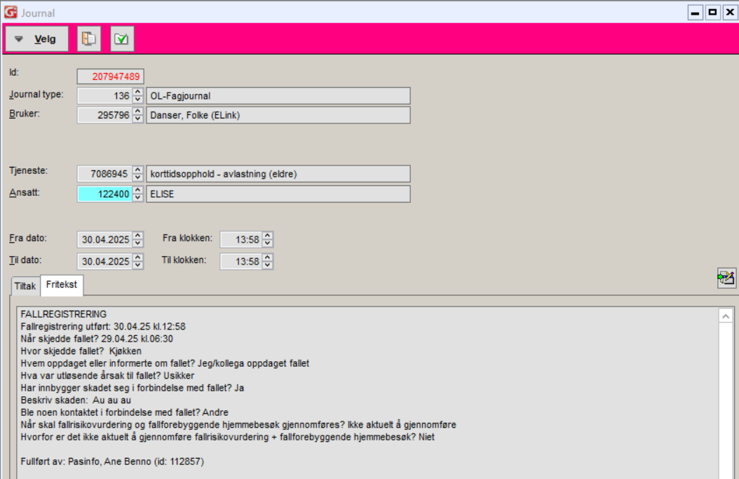 Fallregistrering registrert i ELISE blir overført til OL-Fagjournal (136) knyttes til en relevant tjeneste for tjenester i hjemmet. For fallregistreringer utført i ELISE institusjon, vil disse knyttes mot en relevant institusjonstjeneste i institusjonsjournal (114) og tiltak x.13.2.5, hvis tiltaket er opprettet.