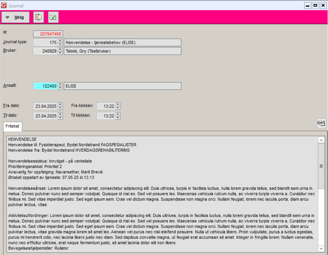Henvendelse blir overført til journal Henvendelse - tjenestebehov (ELISE) (175).
