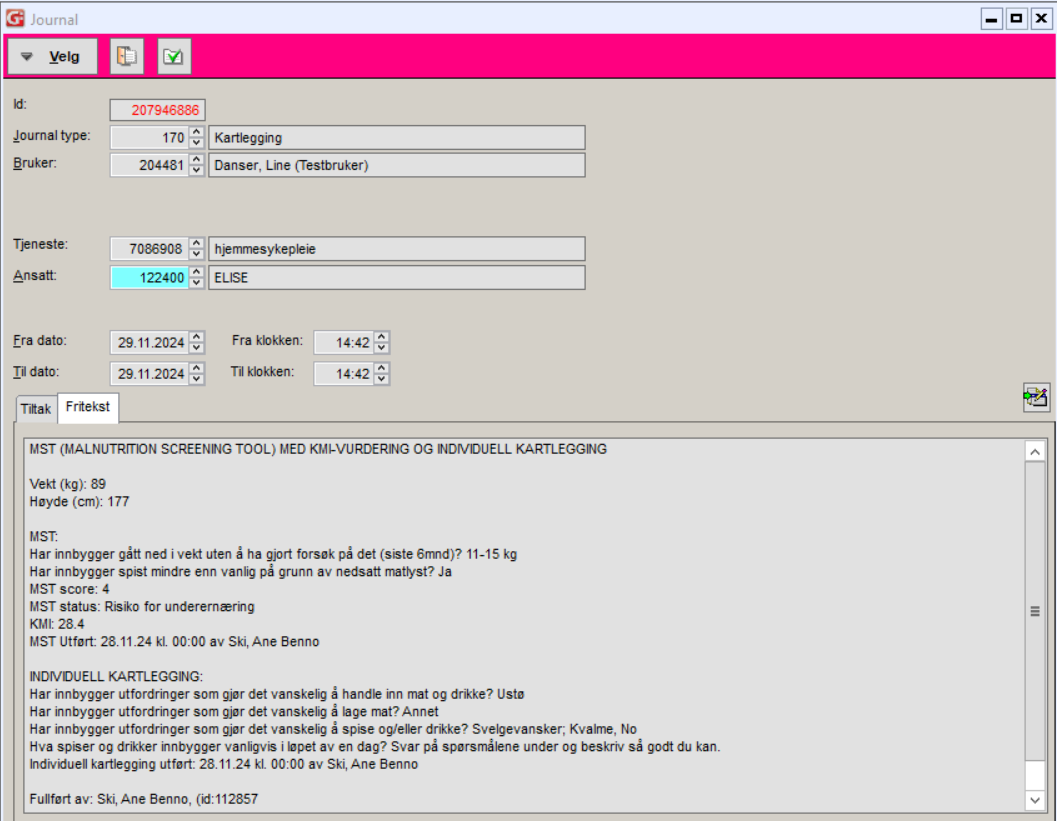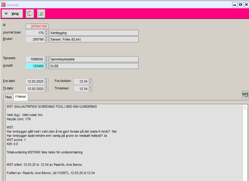 En fullført MST-registrering/ individuell ernæringskartlegging i ELISE trigger overføring av informasjon til tre moduler i Gerica: