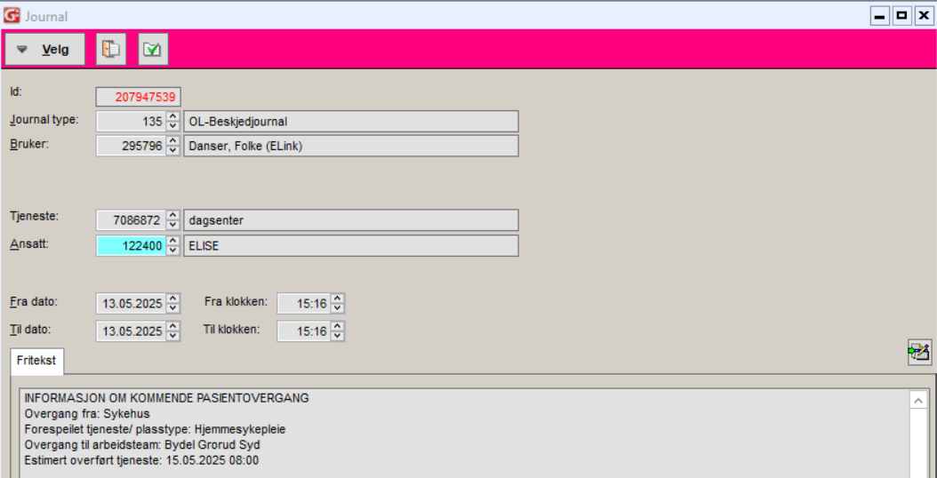 Det opprettes automatisk ny OL-beskjedjournal (135) ved endring av ett av feltene Arbeidsteam, Estimert overført tjeneste og Overgang bekreftet.