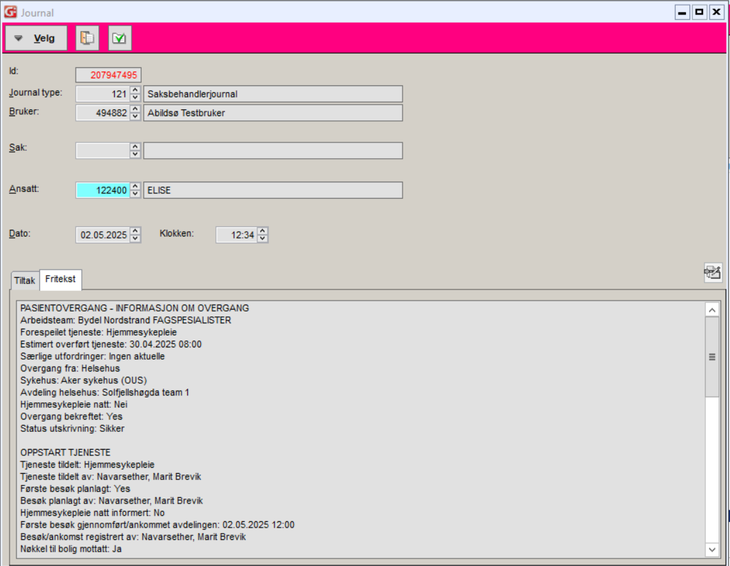 Informasjonen som skrives i journalen er: "Arbeidsteam", "Forespeilet tjeneste/plasstype", "Estimert overført tjeneste (dato)" og "Overgang fra".