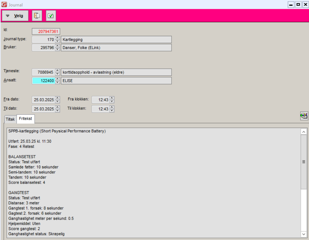 Fullførte SPPB-kartlegginger blir overført til kartleggingsjournal (170), knyttet til tjeneste.
